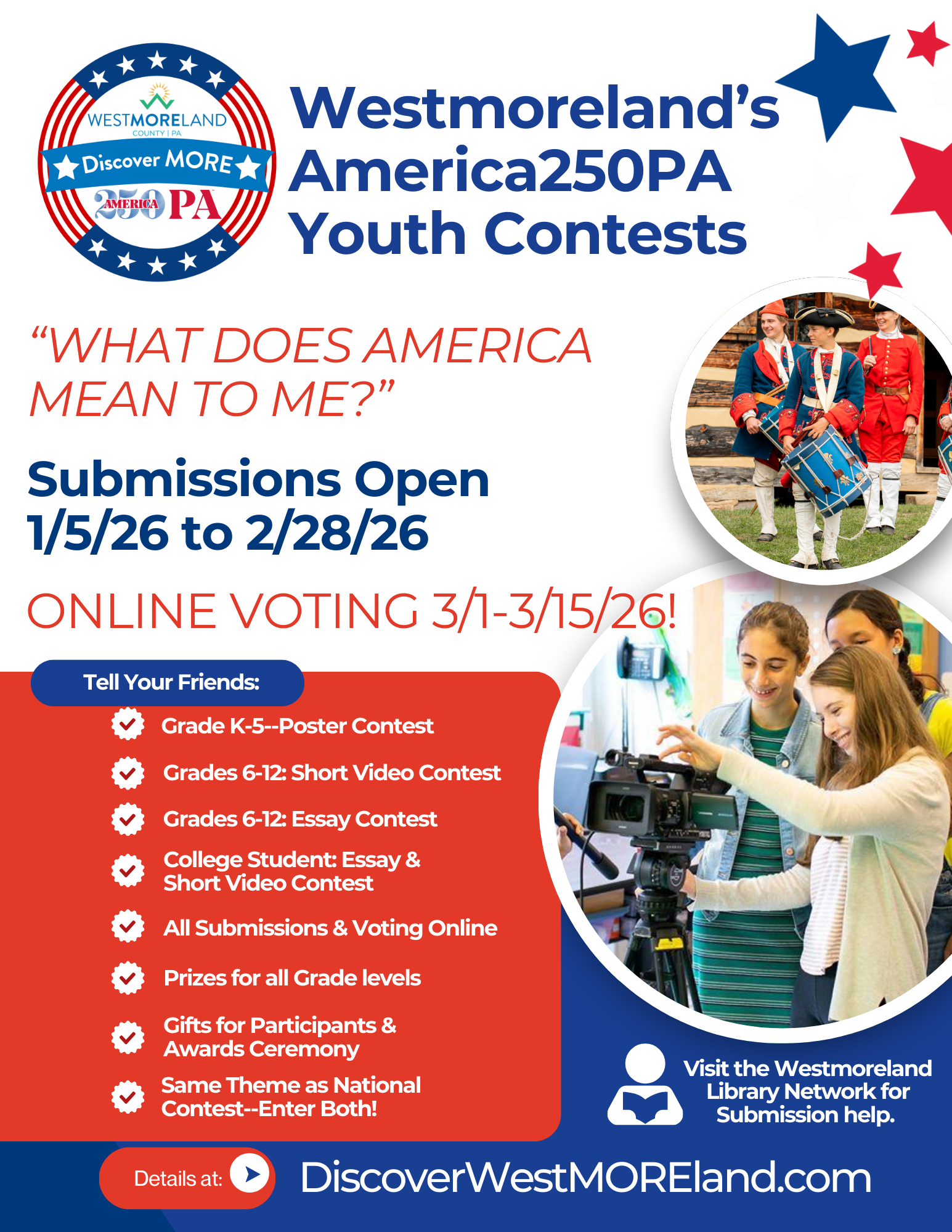 Contest Overview--To commemorate the 250th anniversary of the United States, Westmoreland County America250PA invites students of all ages to reflect on the theme: “What does America mean to me?”
