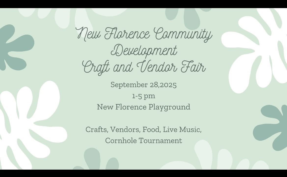 New Florence Community Development a small nonprofit hosts an event every year for homemade crafts and vendors. There will be food available from the New Florence Lions club and New Florence Fire Dept. Live music by Ben Plowman (2pm)and a cornhole tournament (3pm) teams can enter for $20. Event is at New Florence Playground 174 Chestnut st New Florence.
